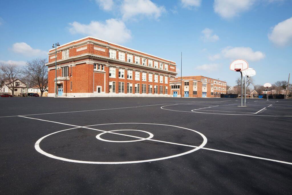 Road markings are also seen in playgrounds. This includes uses like marking out hopscotch squares, marking out football field goal lines on concrete, and other more decorative designs.